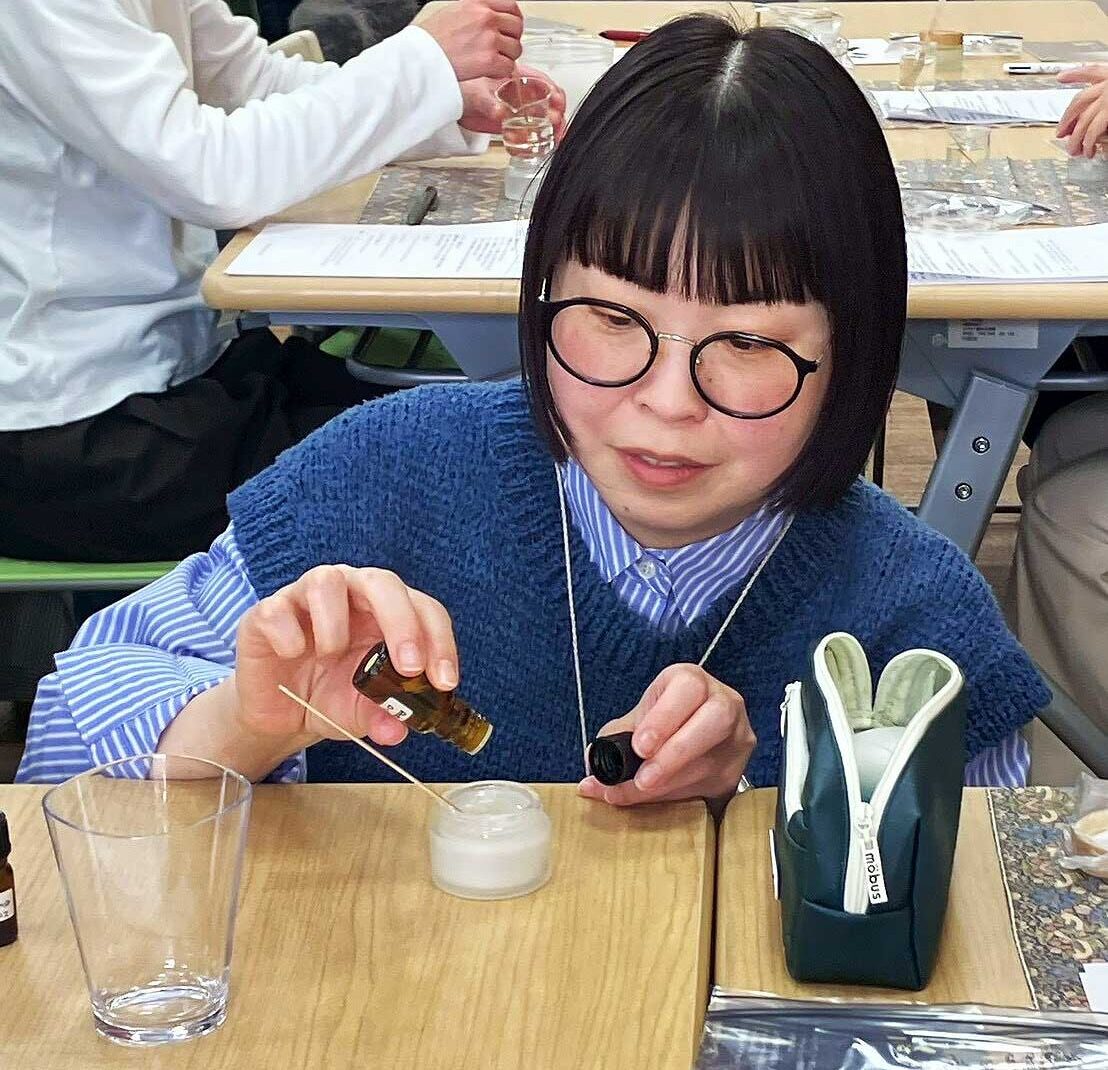 保湿クリームには、HASADANIで育てたローズマリーから抽出したエキスを使用し、自分好みの香りにアロマオイルを配合したオリジナルクリームを作りました。