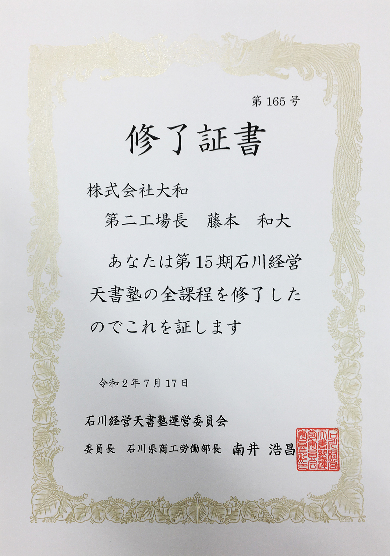 石川県の産業人材の確保の為、経営の様々な局面における実践的思考力を持った人材の養成を目指し、産官学が一体となって開講された「石川経営天書塾」の第15期に弊社社員の藤本和大が受講させていただき、令和2年7月をもって全行程を修了致しました。