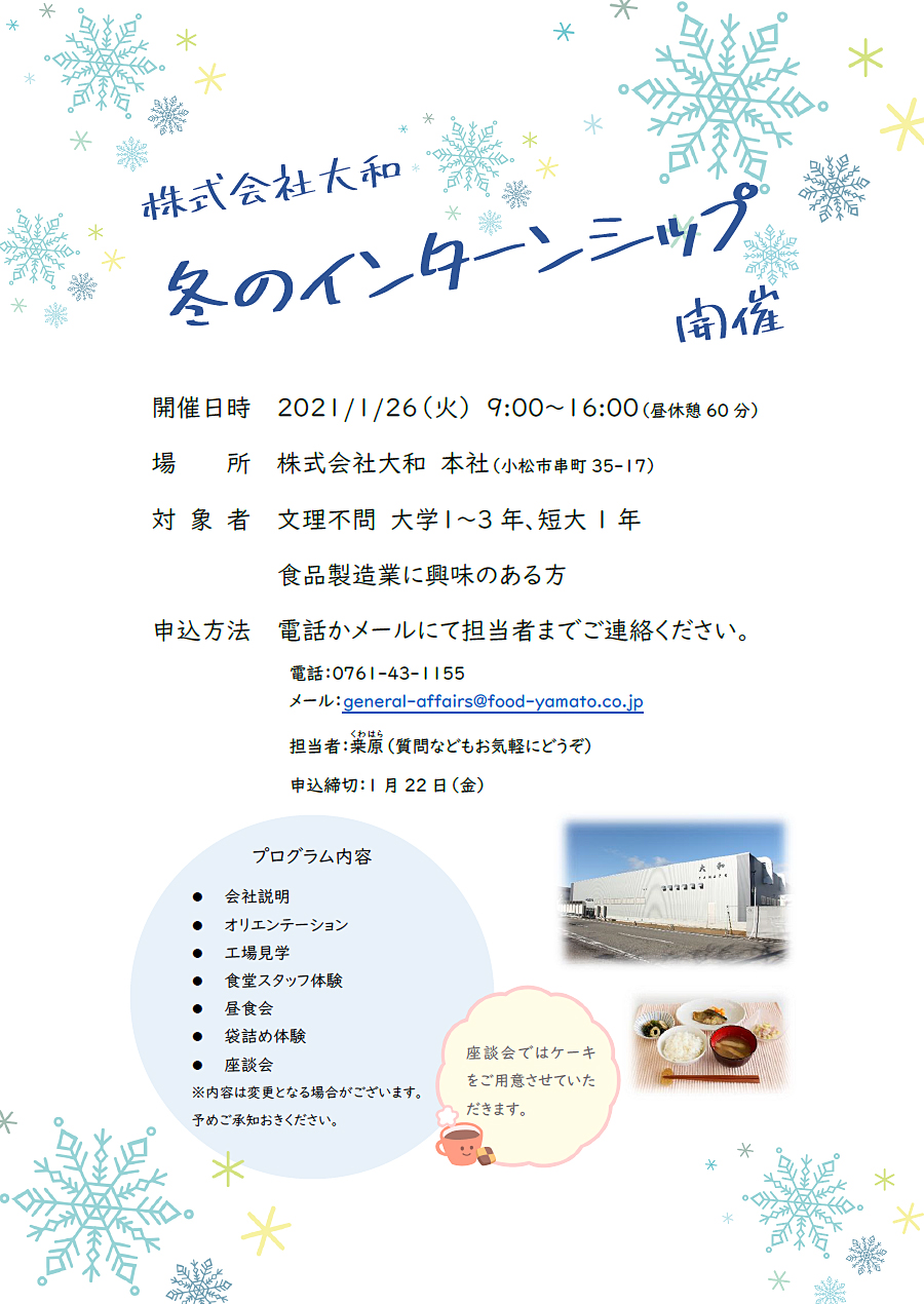 2021年1月26日(火)、弊社の本社工場にて、冬のインターンシップを開催致します。