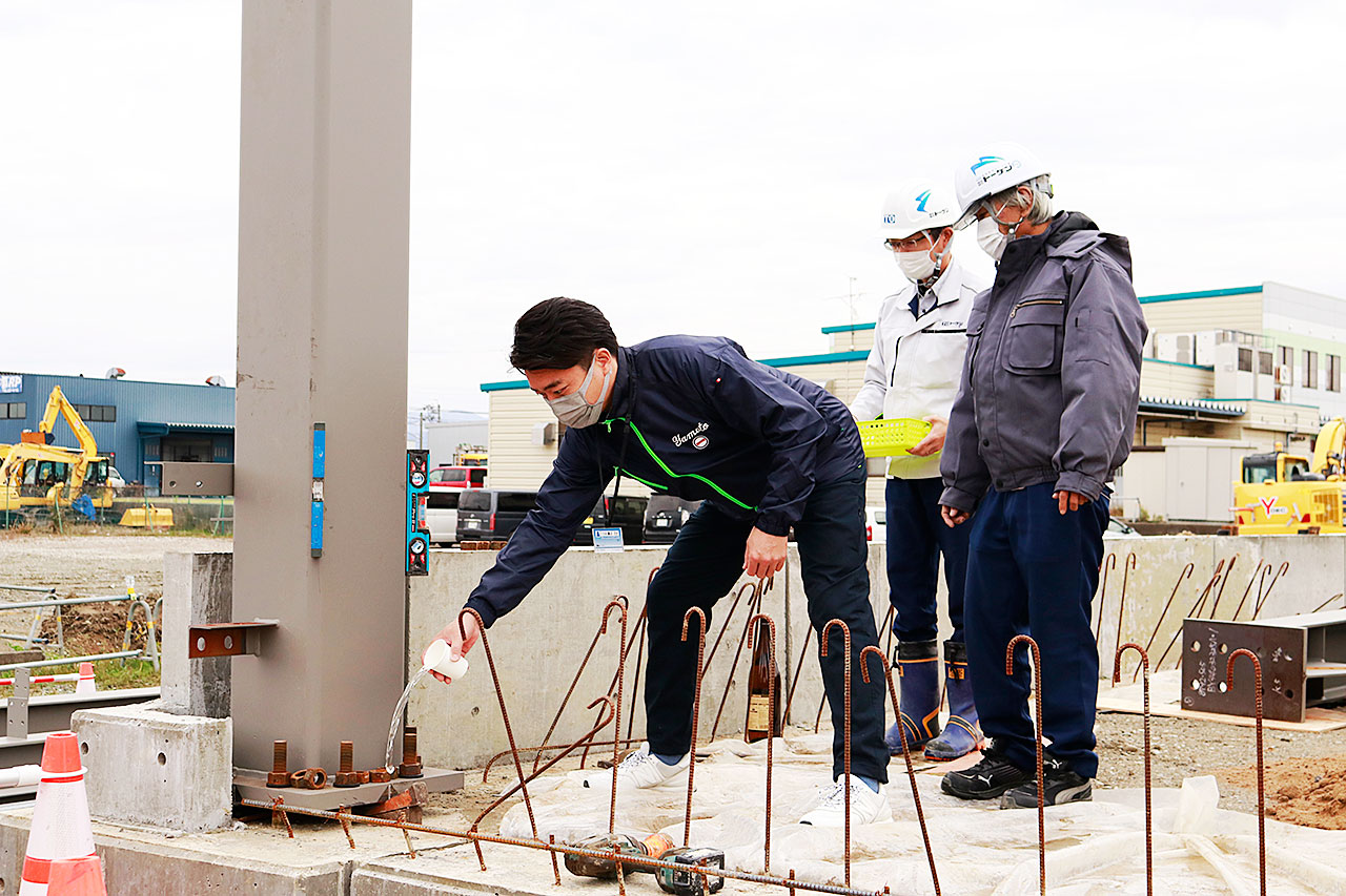 大和の桒原哲也社長がお酒と塩でお清めをして、棟上げまでが無事に終了したことへの感謝と今後の安全を祈りました。