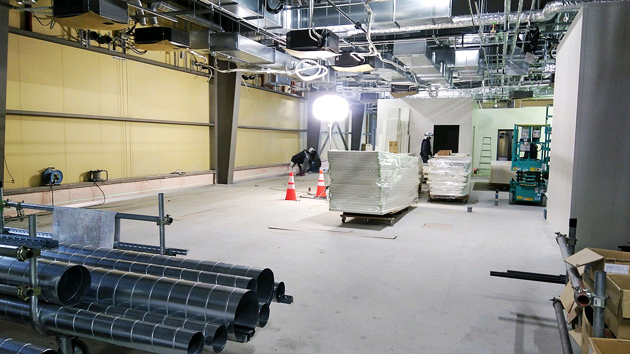 現在(2月18日)天井の配管、配線、ダクトの施工中です。コンクリート土間には線が引かれ、工場内部の位置関係や広さのイメージが現場でわかるようになってきました。 設計、建築、設備ほか大勢の関係者の皆さま、ありがとうございます。