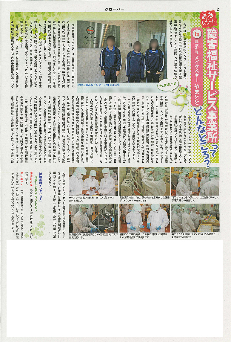 障がいがあっても一般の働きさんと一緒に、区別なく仕事をこなしている様子を取材していただき、2月に各家庭に広報として配布されました。