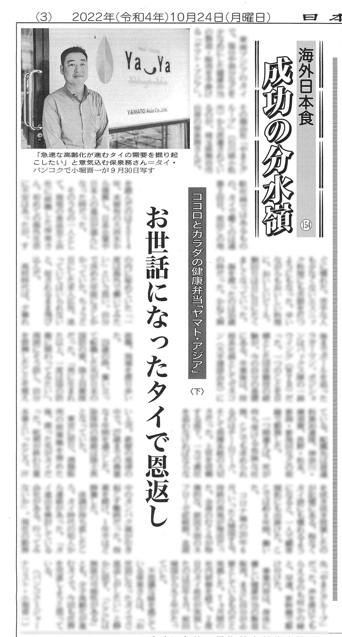 タイ バンコクのYAMATO Asia(Ya-Ya)が10月19日(水)、24日(月)の2回に渡り、日本食糧新聞の「海外日本食 成功の分水嶺」のコーナーに掲載されました。