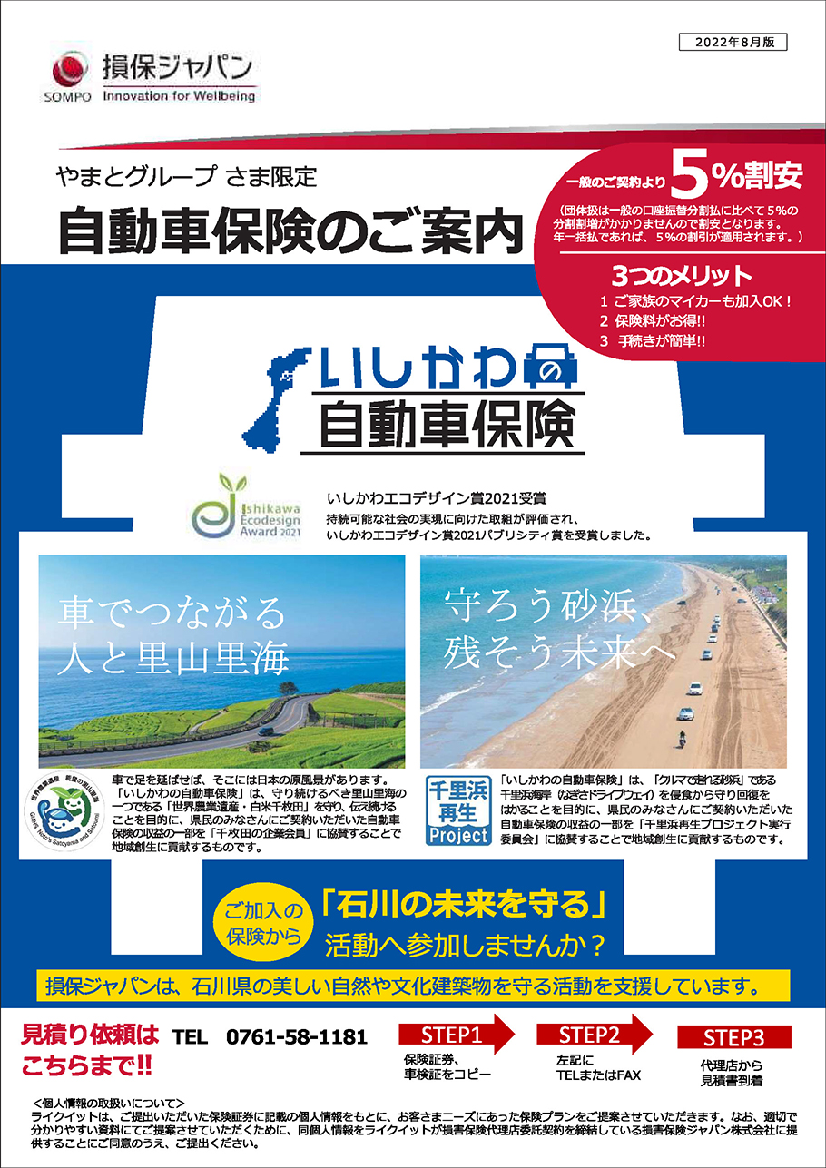 ライクイットでお取扱いさせていただいております保険会社「損保ジャパン」では、皆様にご契約いただいた自動車保険収益の一部を、「世界農業遺産・白米千枚田」の保全と「千里浜海岸(なぎさドライブウェイ)」の再生に協賛することで石川県の美しい自然・文化を守り、地域創生の貢献に取組んでおります。