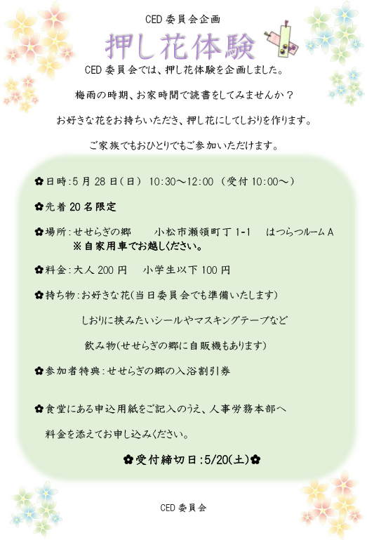 5/28(日)せせらぎの郷にて、やまとグループの働きさん(従業員)とそのご家族を対象とした「押し花体験」を開催いたします。