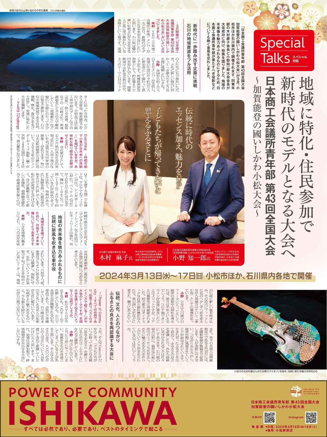 日本商工会議所青年部の木村会長と、やまとグループ株式会社代表 小野の対談の記事が令和6年元旦の北國新聞のスペシャル対談特集に掲載されました。