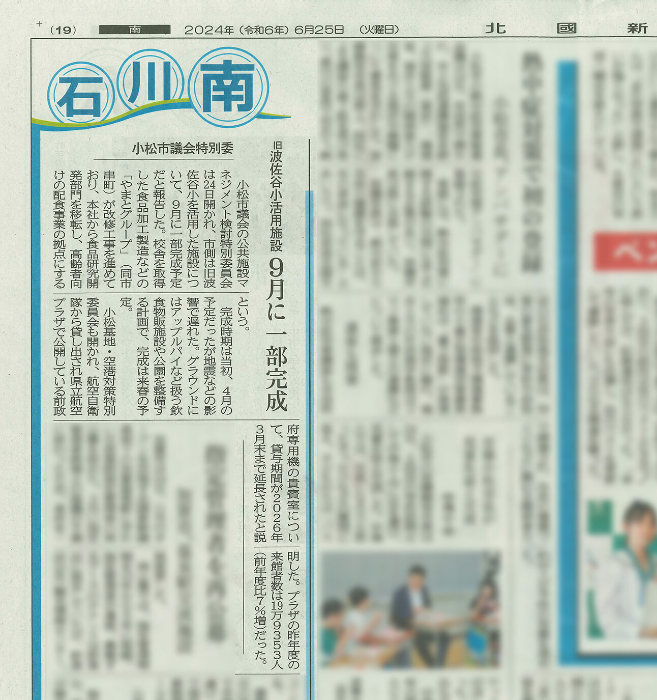 2024年6月25日(水)北國新聞の朝刊の石川南のページに、小松市議会公共施設マネジメント検討特別委員会で、やまとグループが行っている、旧波佐谷小学校の改修、活用についての報告があったことが掲載されました。